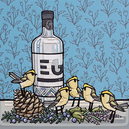 A series of still life arrangements based around drinks, primarily bottles of gin, and their botanical ingredients - with a birdy pun for good fun.